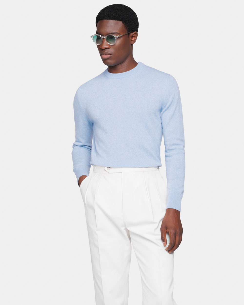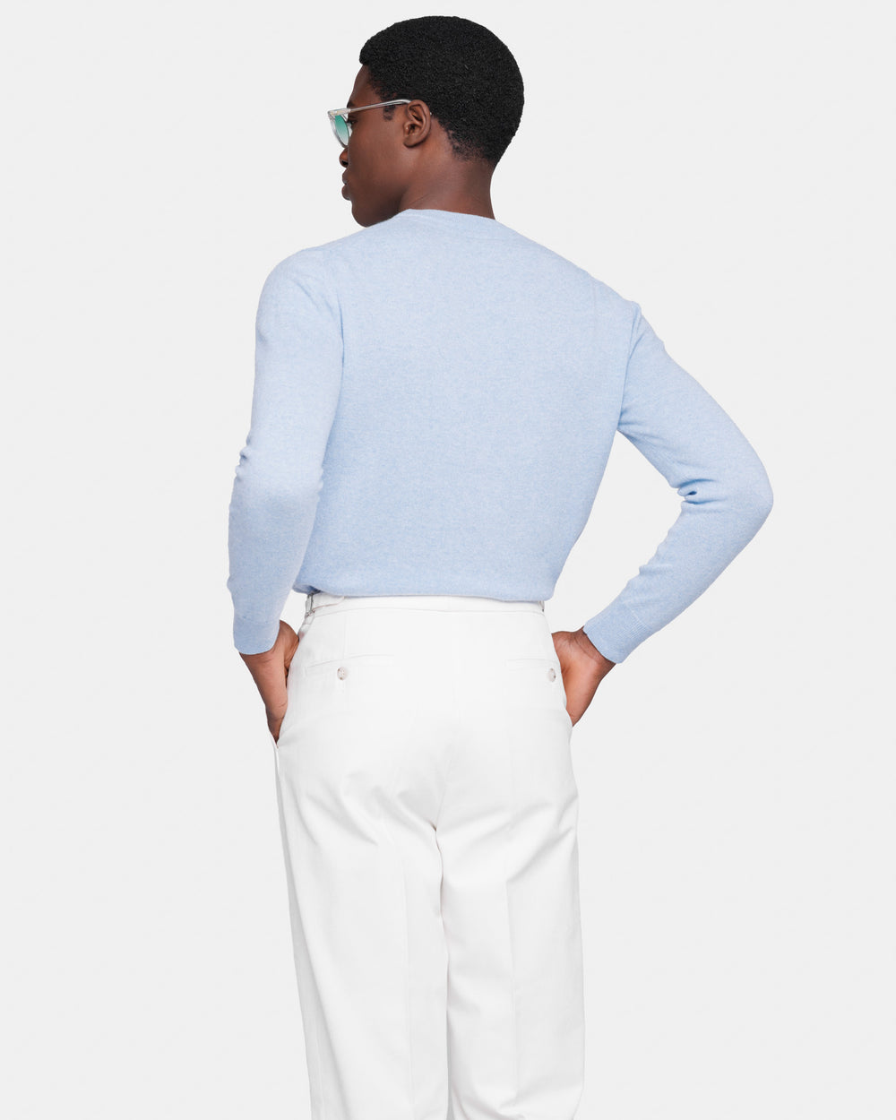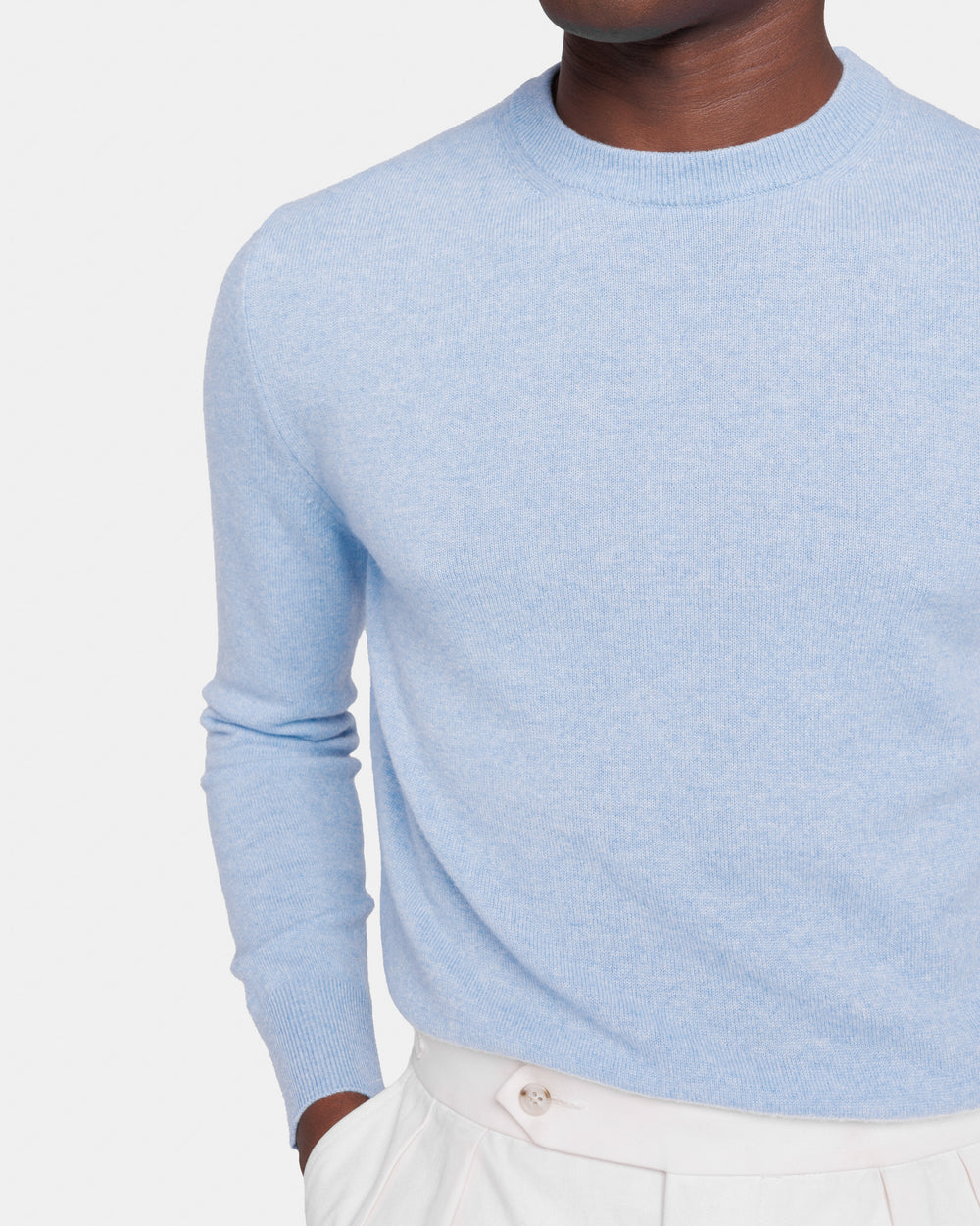 Maglia su misura ad 1 filo dal titolo 2/27 manica lunga tinta unita cielo scollo tondo, realizzata in una pregiata, ricercata e finissima fibra di puro cashmere Crown Reserve proveniente dalle regioni più remote della Mongolia, per arrivare negli stabilimenti di Quarona Sesia in Piemonte, dove viene abilmente lavorata dalla filatura più prestigiosa al mondo per dare vita ad un filato cardato dal titolo 2/27.