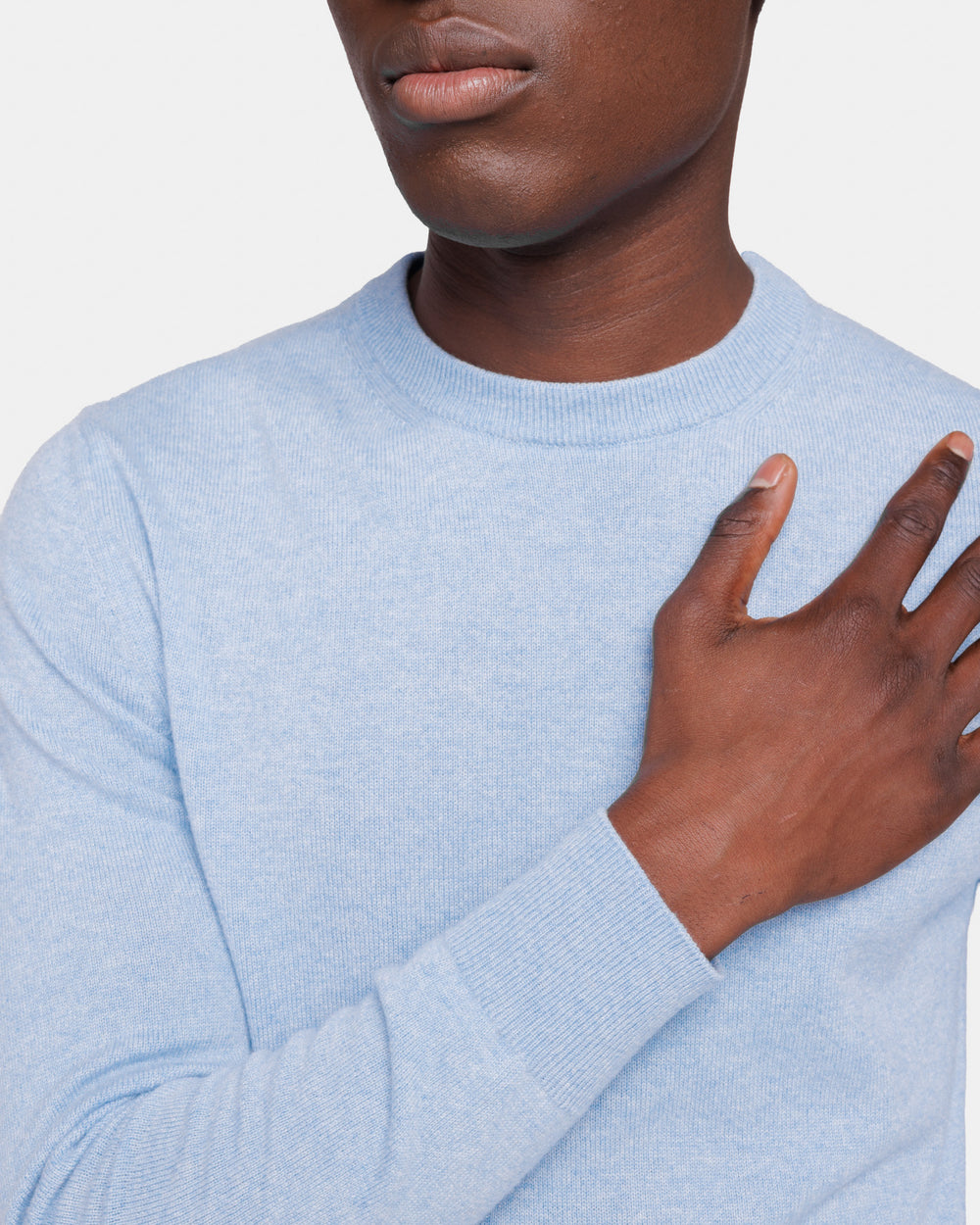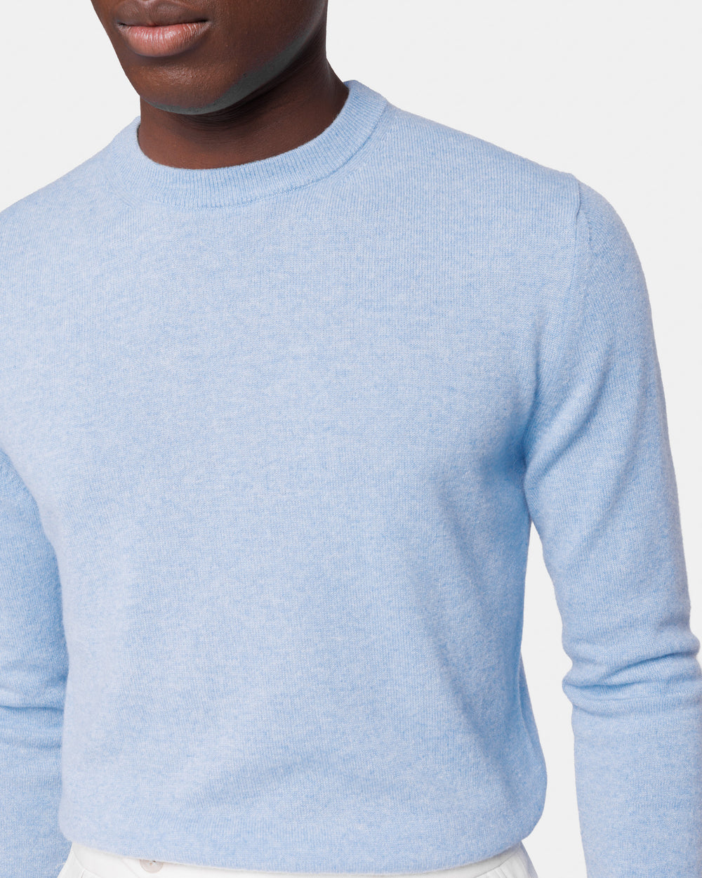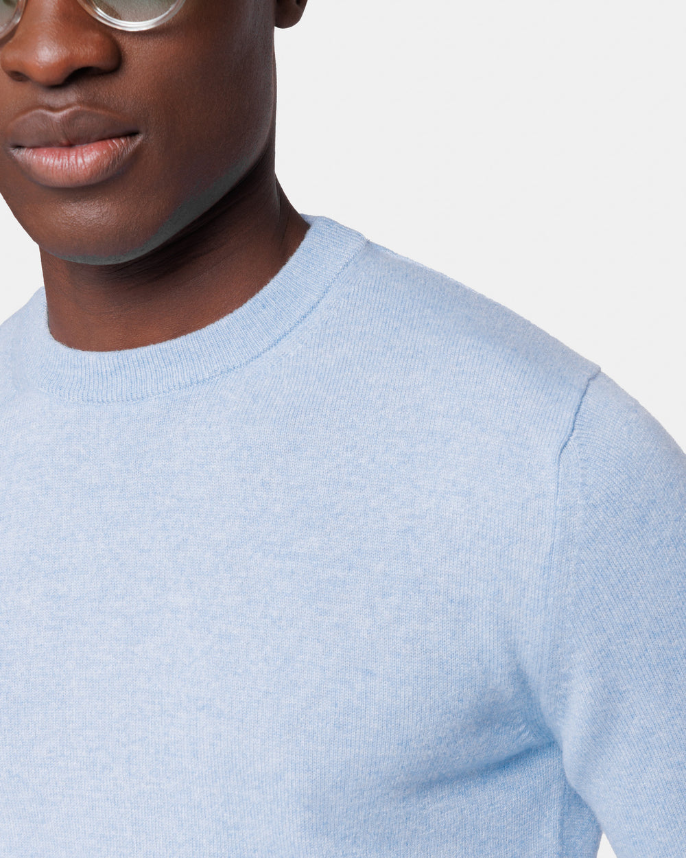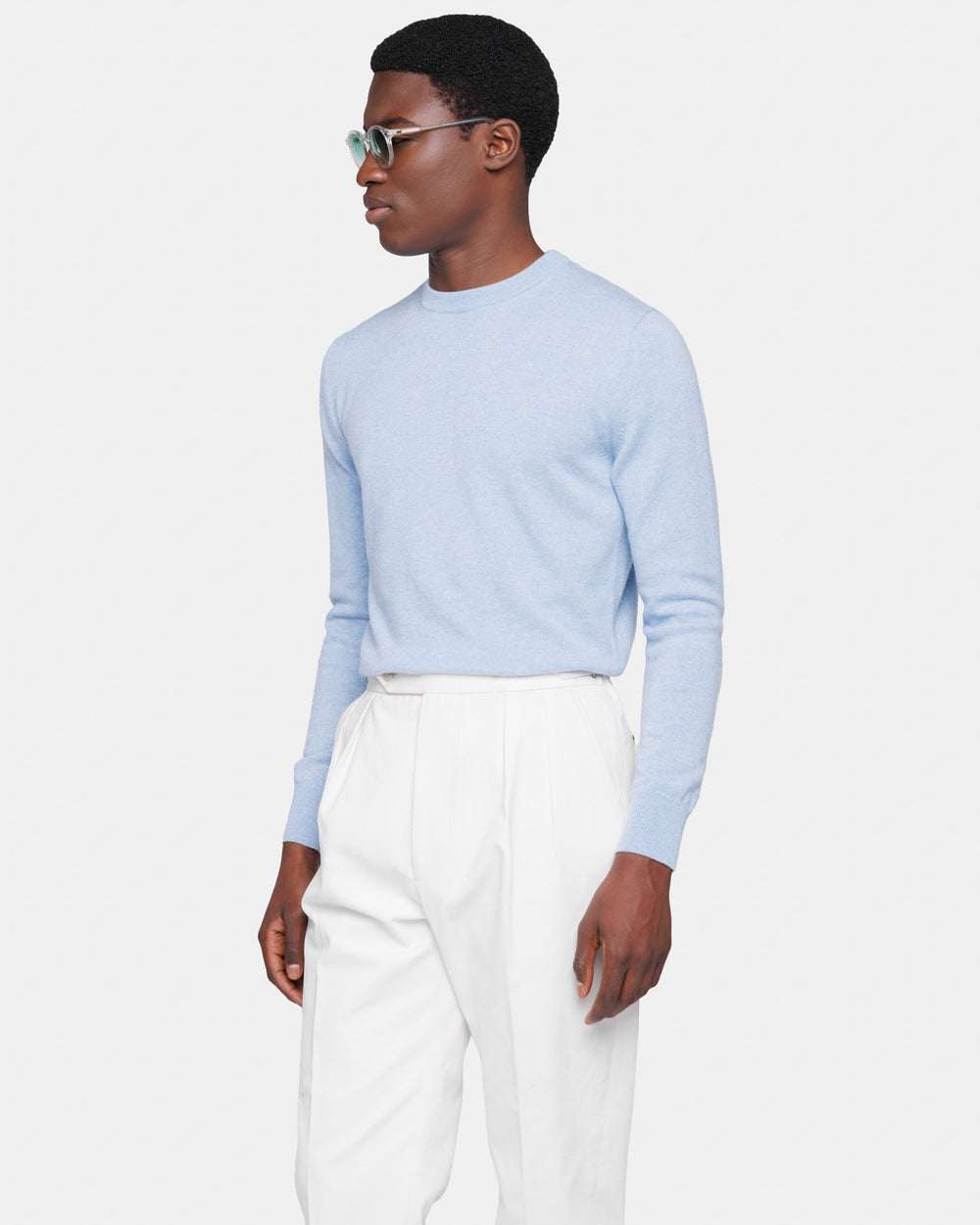 Maglia su misura ad 1 filo dal titolo 2/27 manica lunga tinta unita cielo scollo tondo, realizzata in una pregiata, ricercata e finissima fibra di puro cashmere Crown Reserve proveniente dalle regioni più remote della Mongolia, per arrivare negli stabilimenti di Quarona Sesia in Piemonte, dove viene abilmente lavorata dalla filatura più prestigiosa al mondo per dare vita ad un filato cardato dal titolo 2/27.