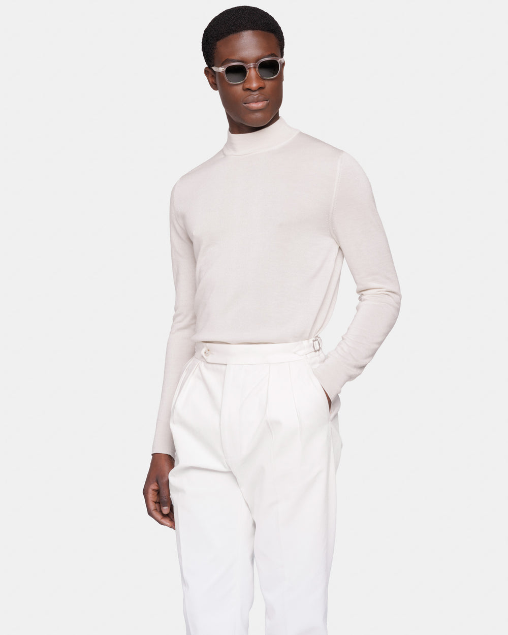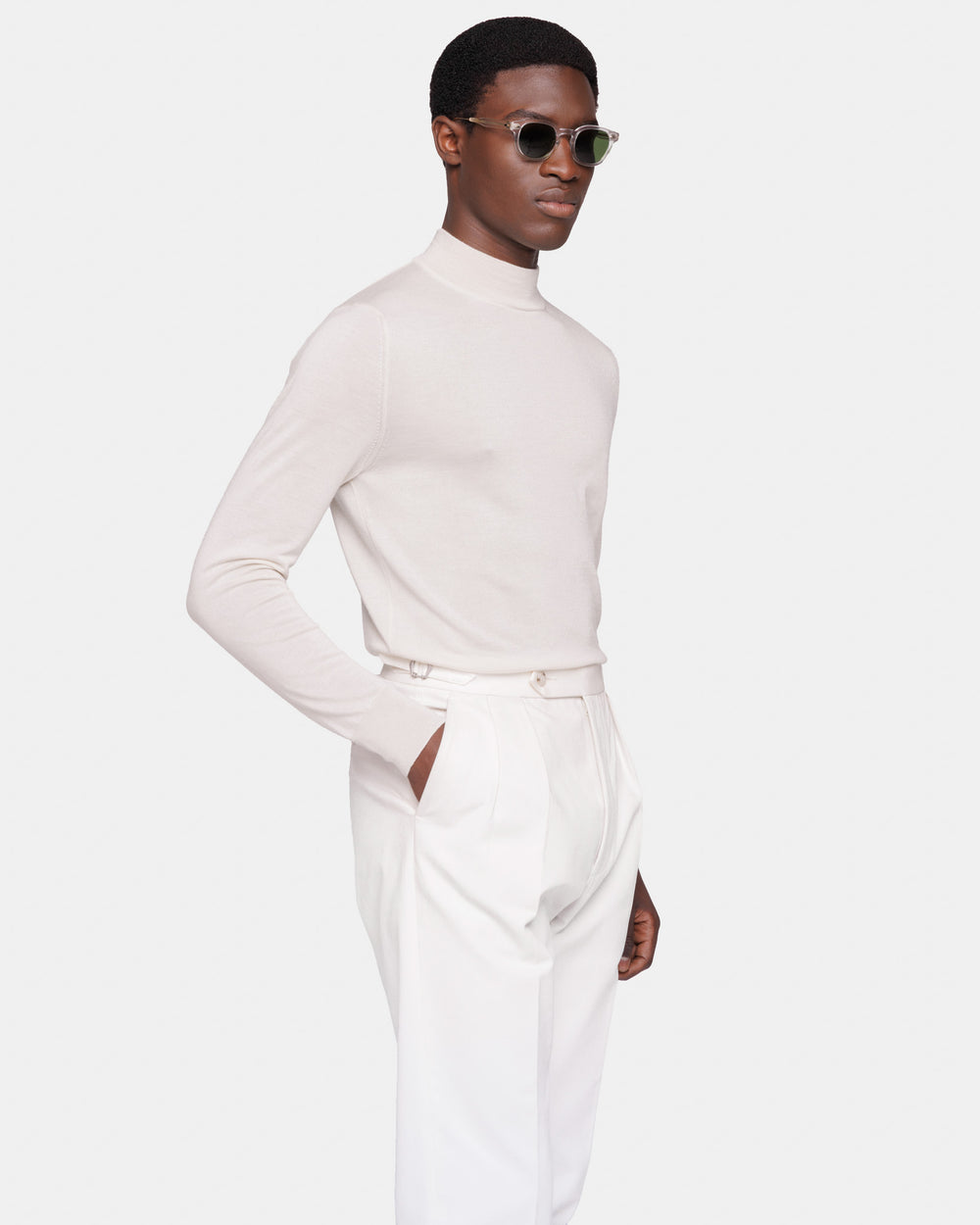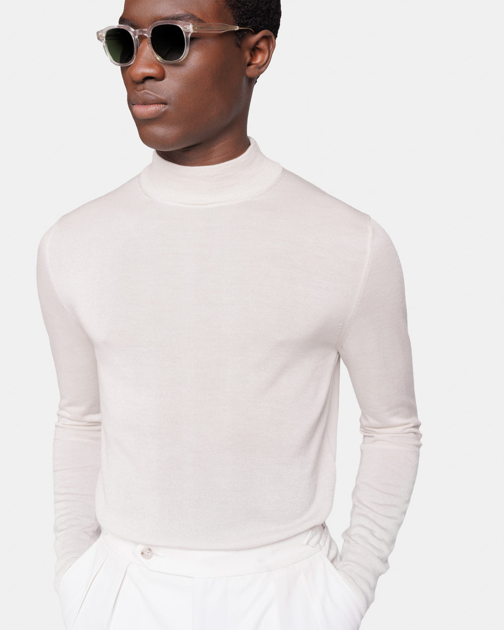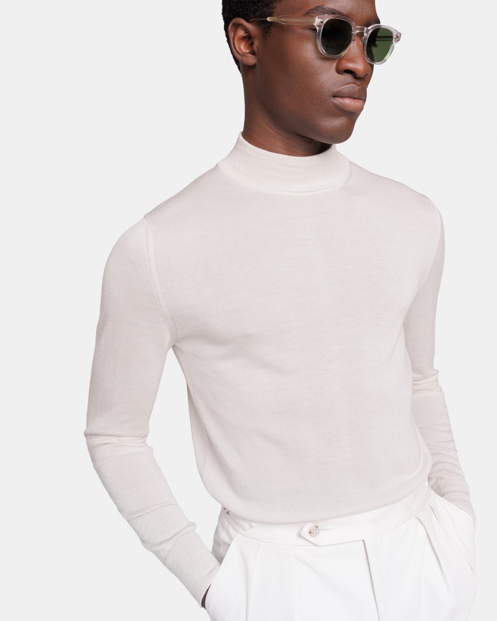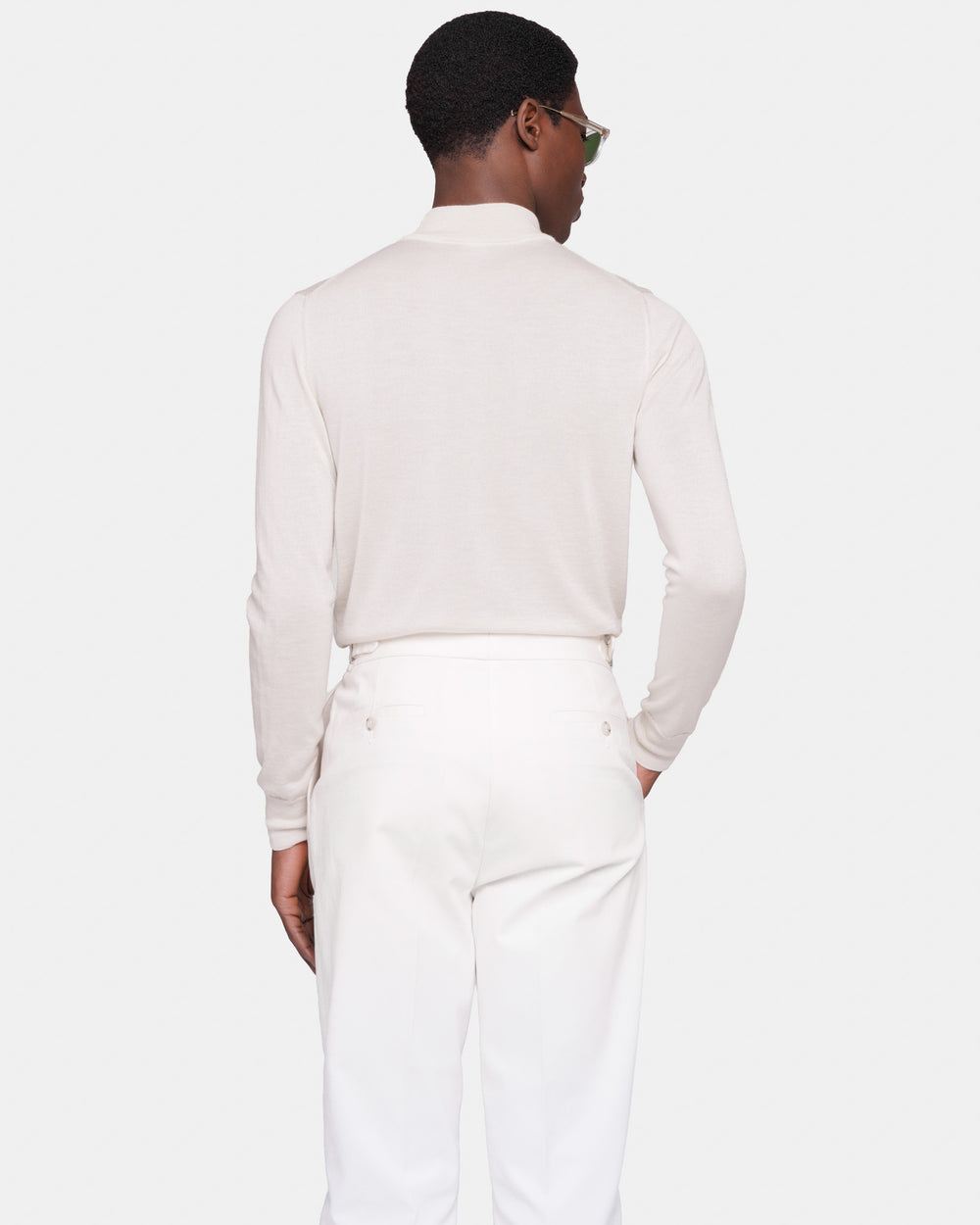 Maglia su misura rasata ad 1 filo ultra-fine dal titolo 2/48 manica lunga tinta unita natural modello lupetto, realizzata in una pregiata, brillante e morbida combinazione di finissimo cashmere e seta Mulberry, la più rara al mondo.