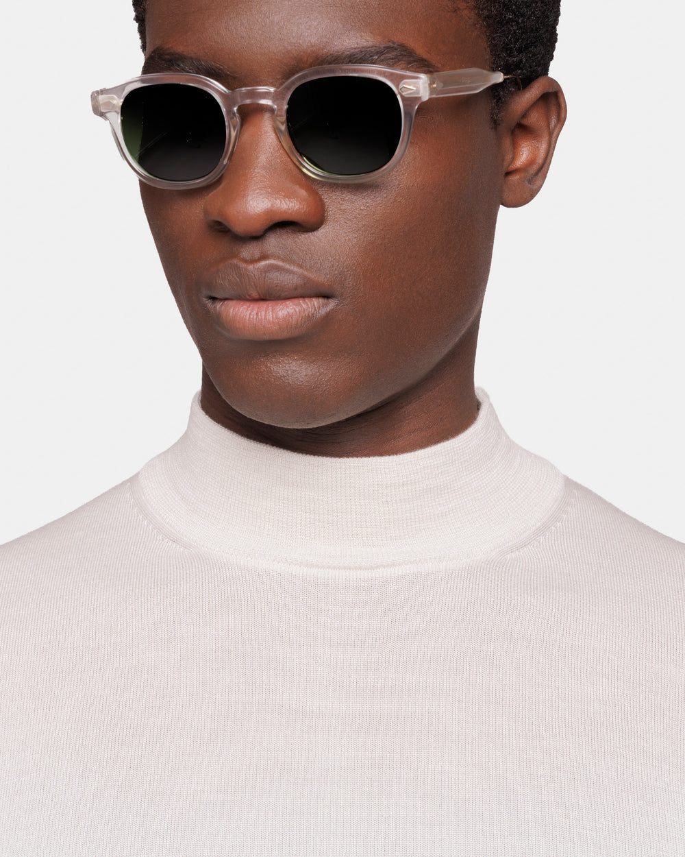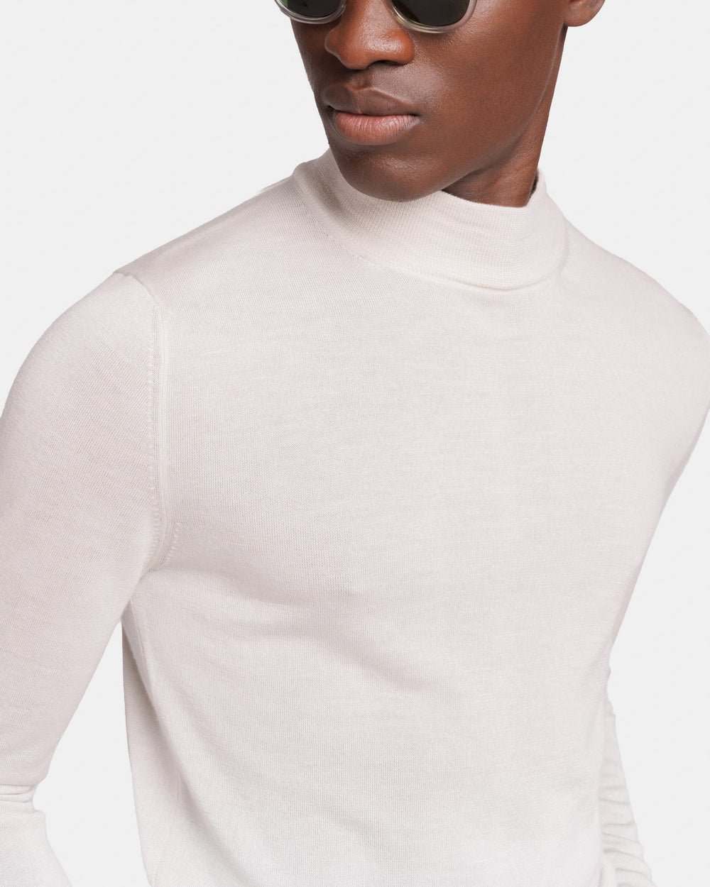 La pregiata miscela di cashmere e seta di Filatori conferisce alla maglia la sua distintiva eleganza. La maglia naturale offre una sensazione di estrema morbidezza sulla pelle, trasformando un design semplice in un capo di lusso. Il colletto alto 5 cm dona un tocco di sartorialità aggiuntiva al capo.