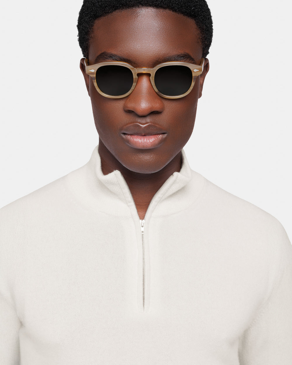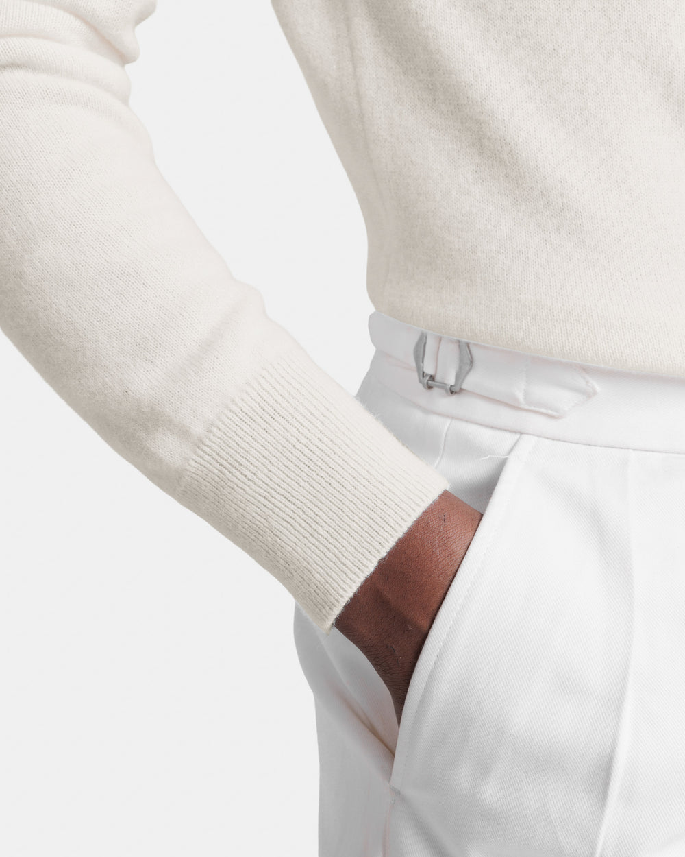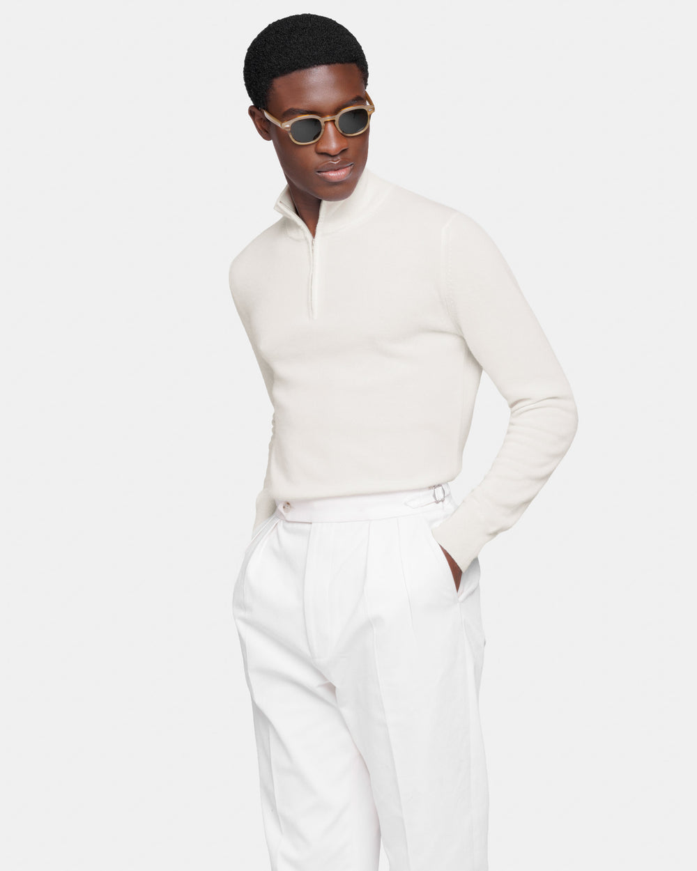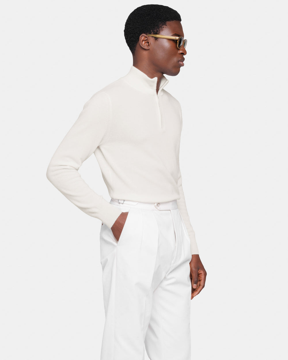 Tailor-made 1-ply half zip knit with a 20 cm Riri zipper, 2/27 yarn gauge, long sleeves, in off-white color, made from a precious, refined, and ultra-fine pure cashmere Crown Reserve fiber coming from the most remote regions of Mongolia, then reaching the mills of Quarona Sesia in Piedmont, where it is skillfully processed by the world’s most prestigious spinning mill to give life to a 2/27 carded yarn.
