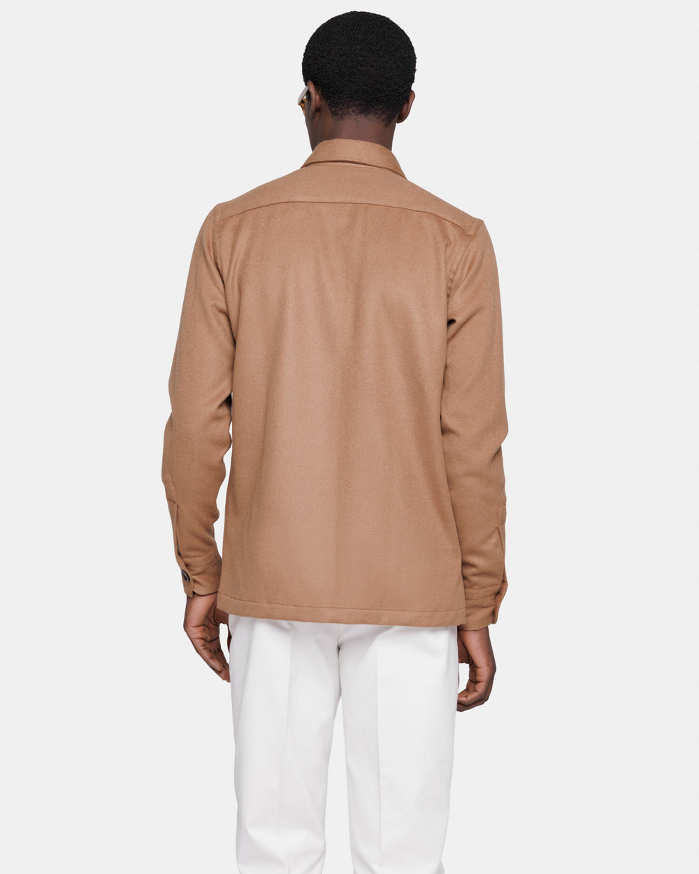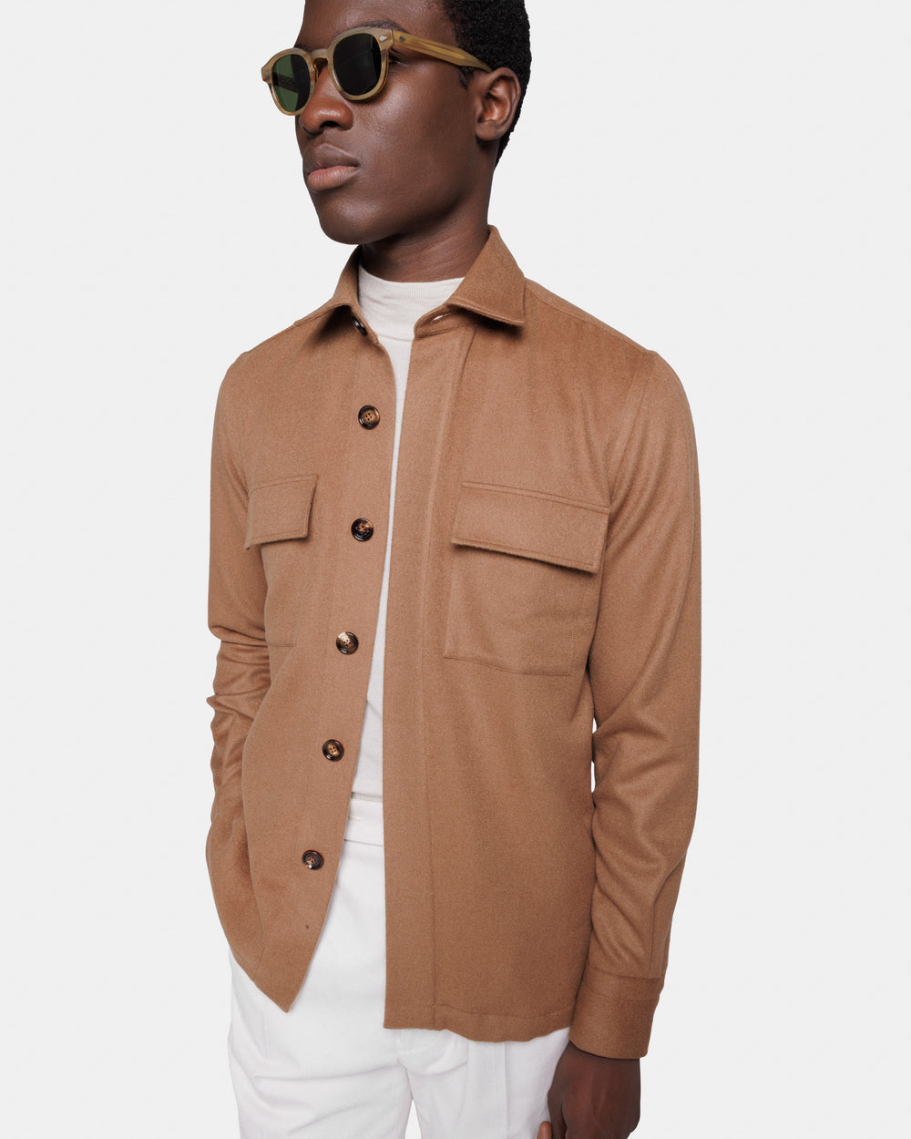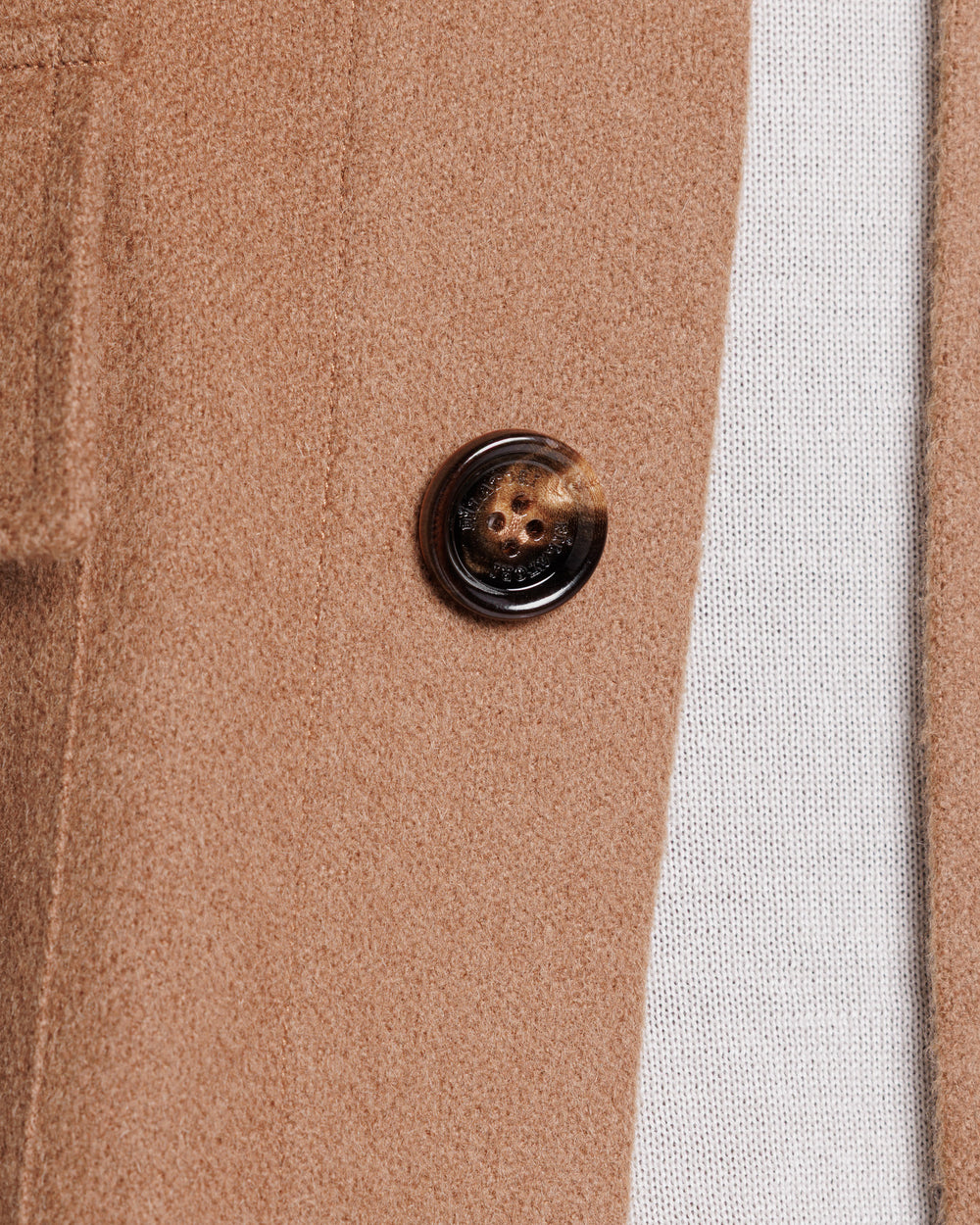 Tailor-made taupe solid-color Overshirt with authentic 32 mm Buffalo Horn buttons, crafted from Loro Piana Bactrian 100% Baby Camel Hair fabric, made in Italy.