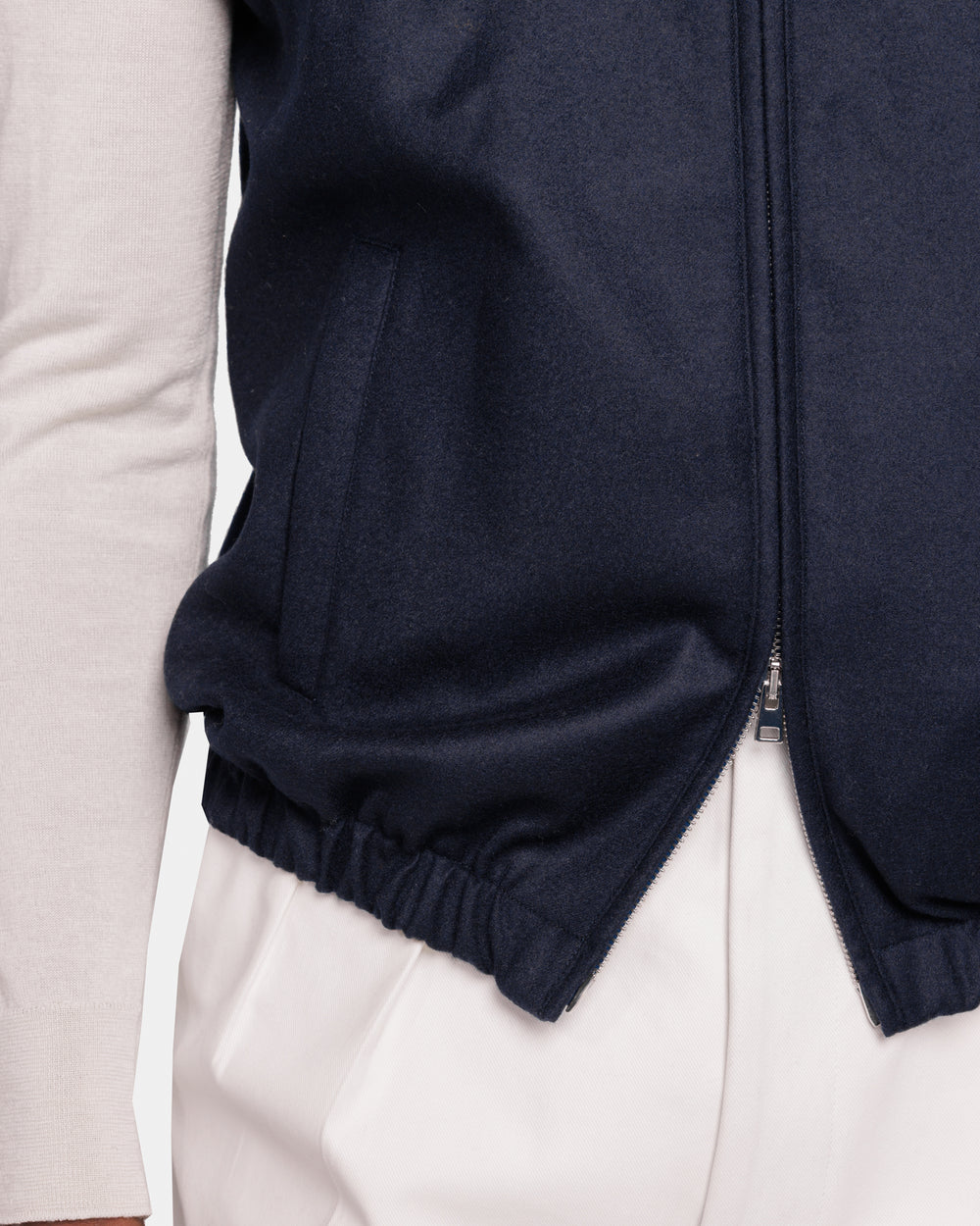Slash pockets provide essential practicality, while the high collar protects from wind while preserving a clean silhouette. The nickel-free metal double-zip with 5 mm teeth is engineered for smooth, durable performance. Inside, a pocket secured with a genuine buffalo horn button safely holds a phone or wallet. The 2 cm elasticated hem ensures an adaptable, comfortable fit.