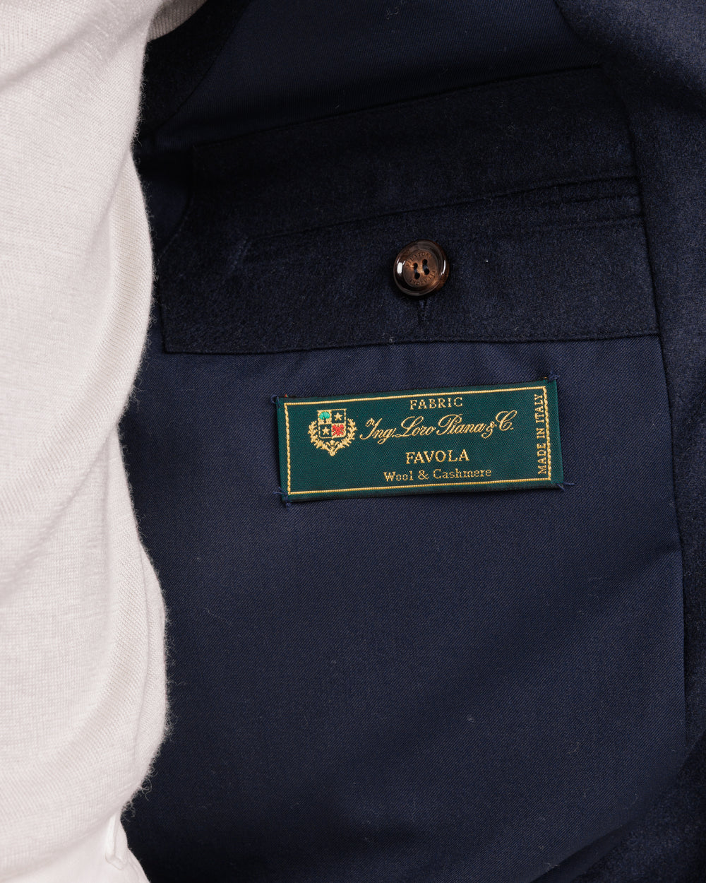 The outer wool-cashmere “Favola” cloth from Loro Piana combines softness, lightness, and natural protection from moisture, while the interior in pure Super 120’s wool by Vitale Barberis Canonico Sunny Season ensures breathability and thermal comfort. The result is an ultra-light yet warm garment, conceived with a classic close fit that allows it to be worn alone or under another piece without adding unnecessary bulk.