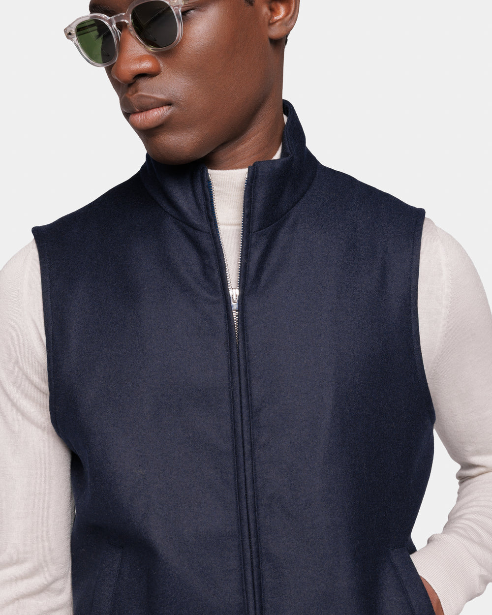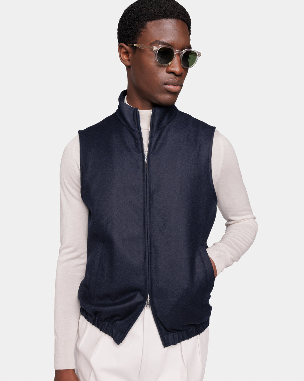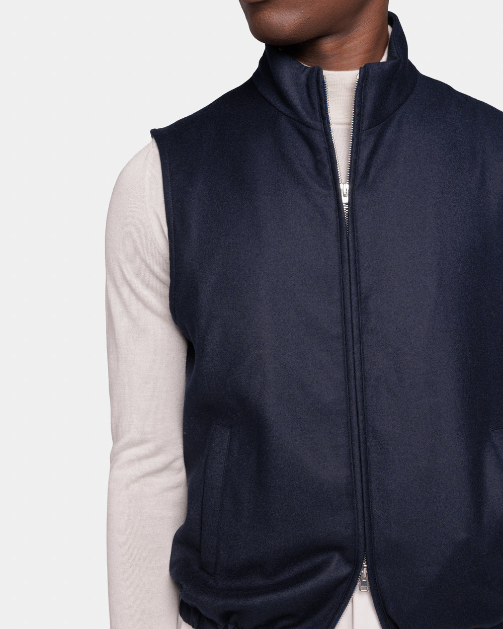 Tailor-made blue vest in water-repellent 95% wool and 5% cashmere fabric, unpadded, with stand collar and double-zip front, designed for impeccable layering and elevated functionality in the contemporary wardrobe.