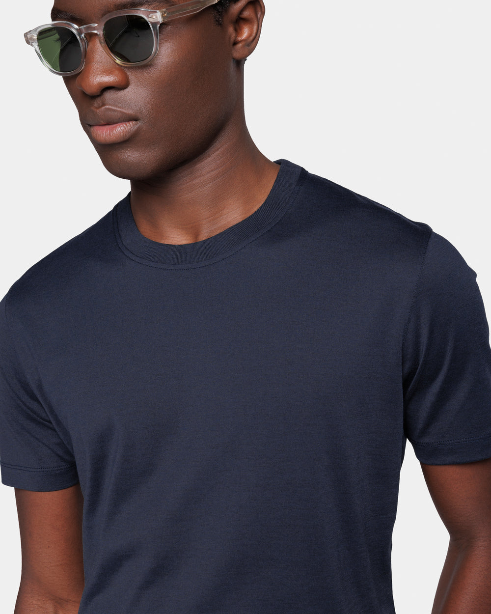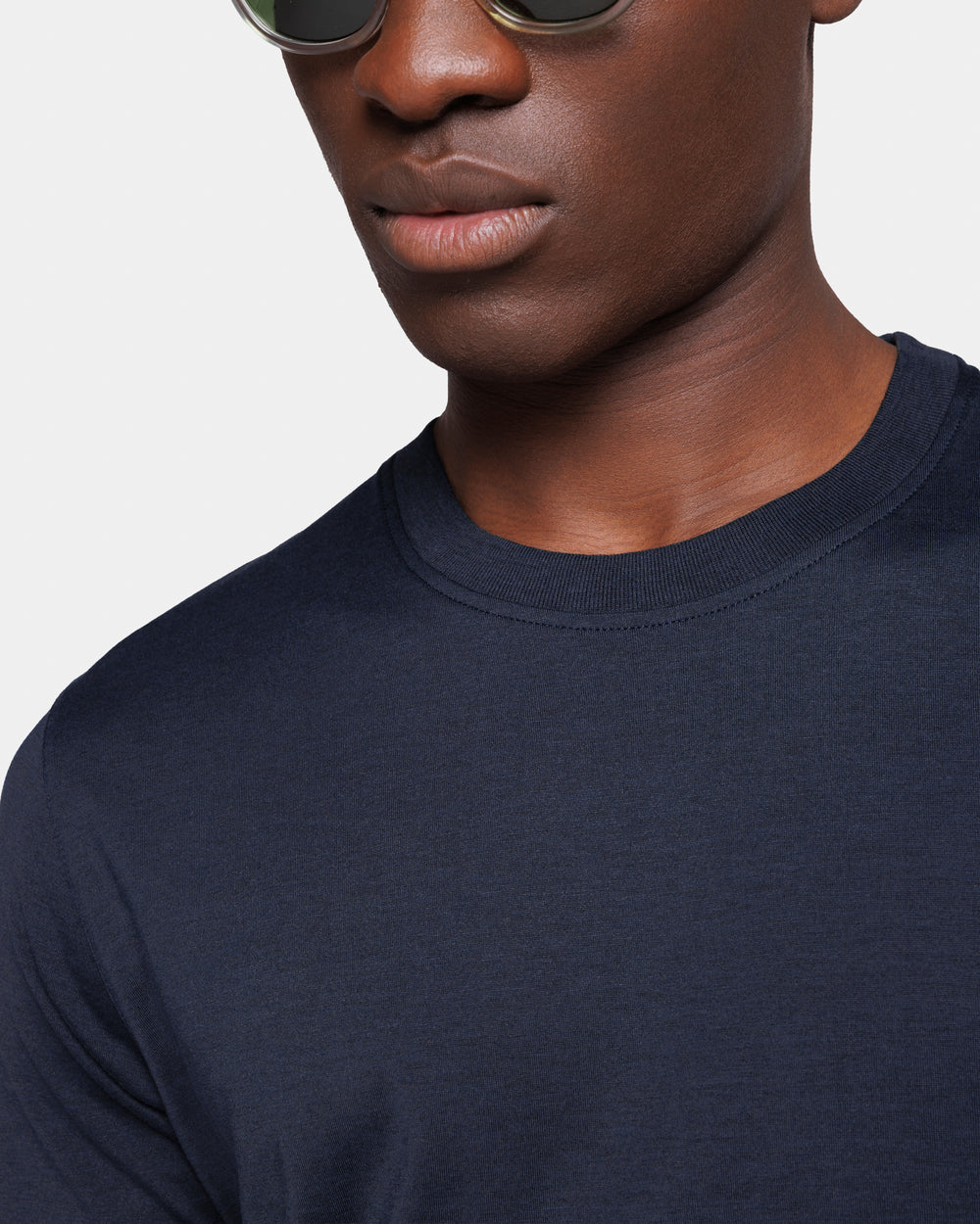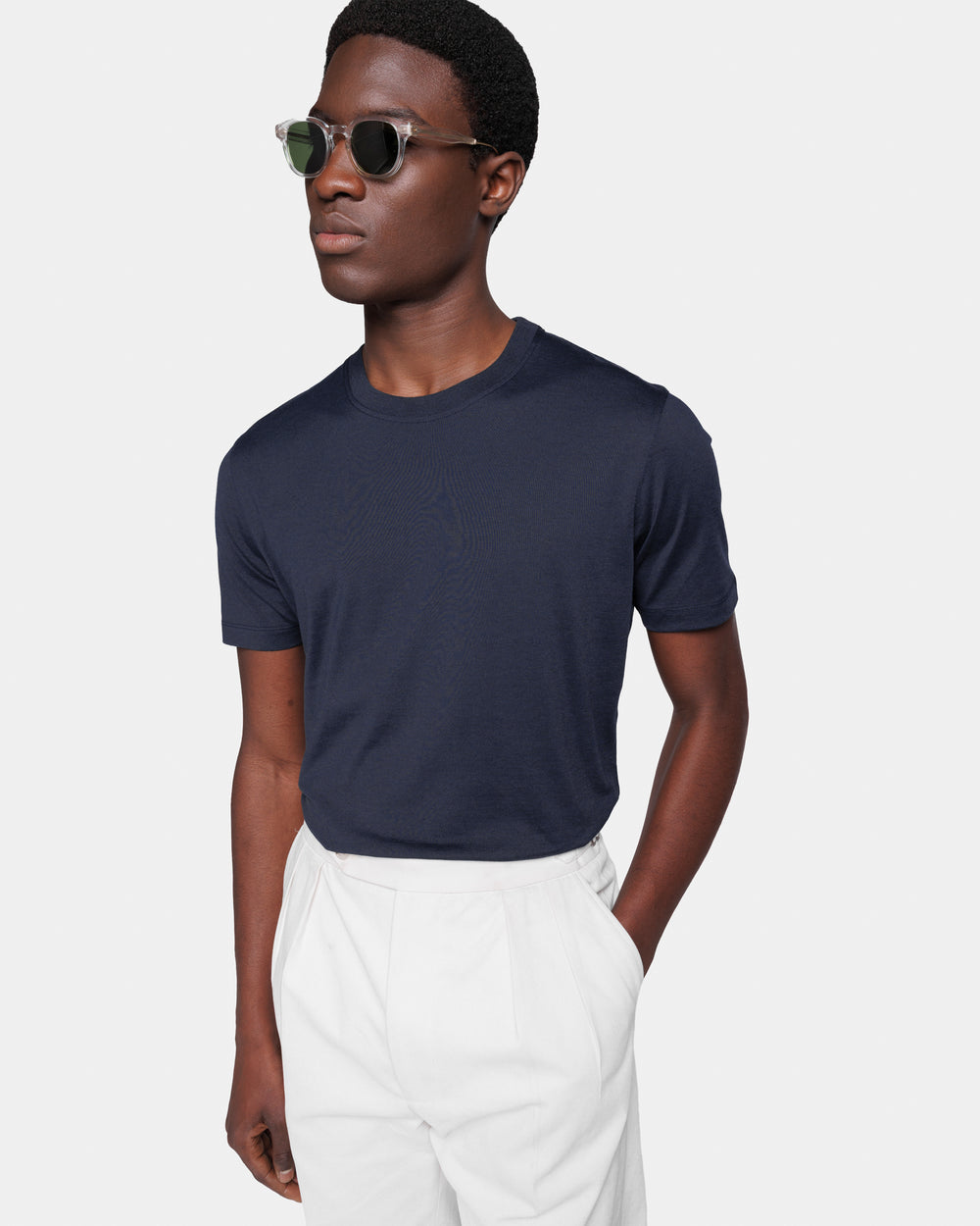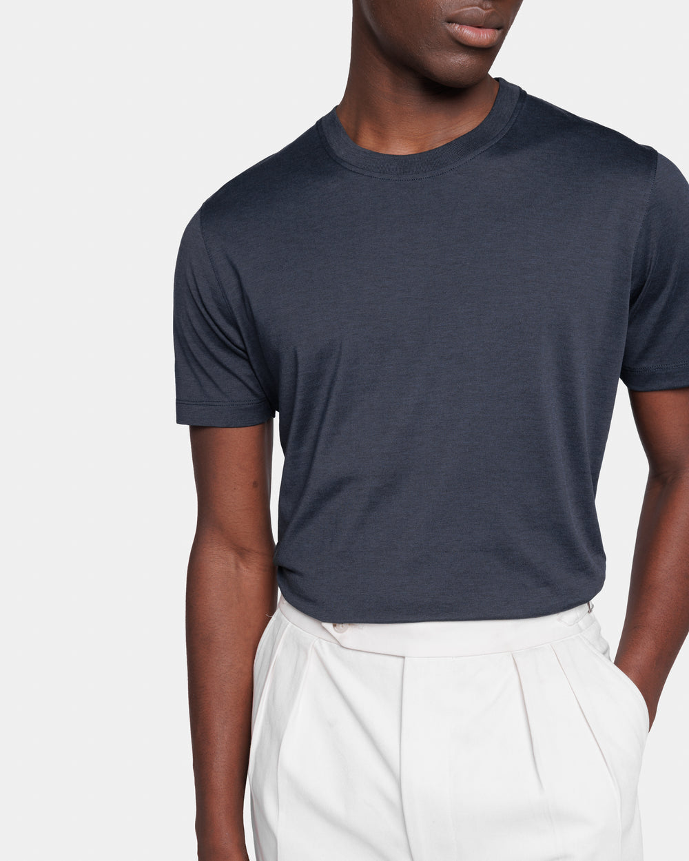 Crafted in the luxurious blend of 60% Mulberry Silk and 40% Organic Cotton jersey 2/115,000, knitted on a 28-gauge frame in navy blue from the Italian weaving mill Maglificio Maggia, it boasts an extraordinarily soft handfeel and a semi-matte appearance. Combining the freshness of cotton with the lightness and luminosity of silk, it evokes the summer atmospheres of remote islands and the decidedly relaxed spirit of our collections.