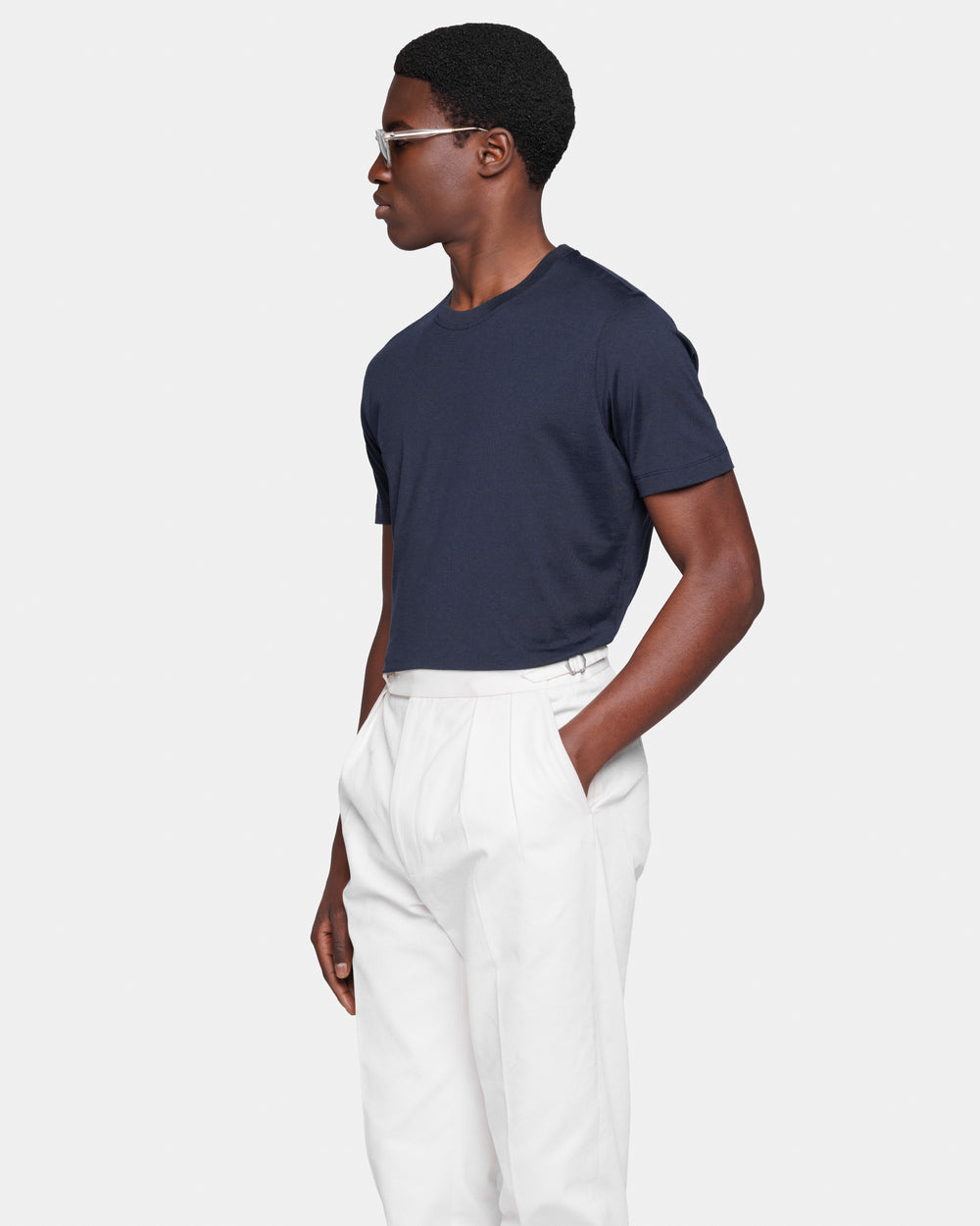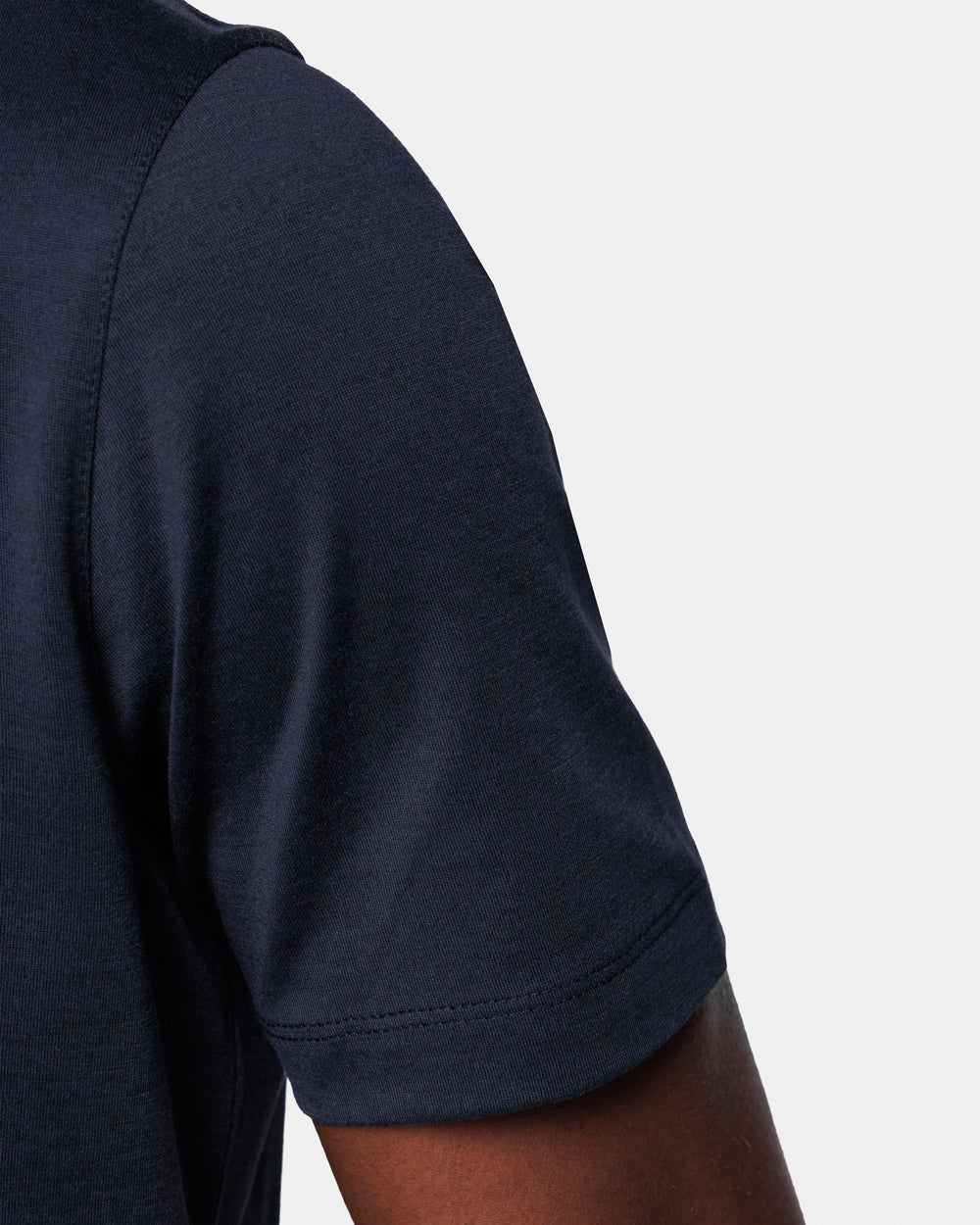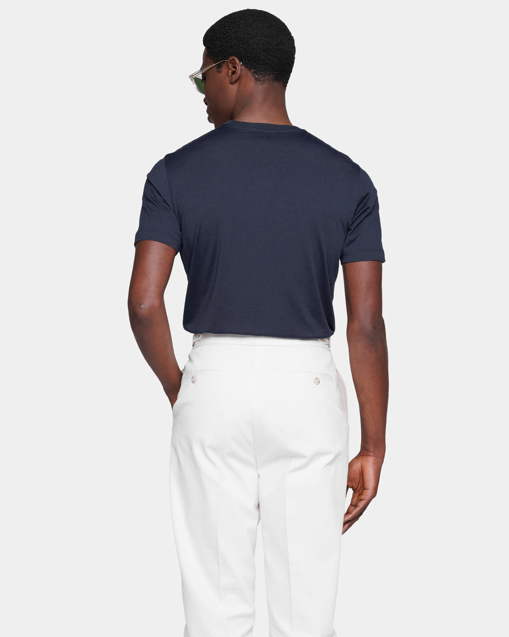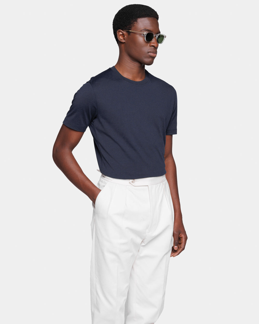 Crafted in the luxurious blend of 60% Mulberry Silk and 40% Organic Cotton jersey 2/115,000, knitted on a 28-gauge frame in navy blue from the Italian weaving mill Maglificio Maggia, it boasts an extraordinarily soft handfeel and a semi-matte appearance. Combining the freshness of cotton with the lightness and luminosity of silk, it evokes the summer atmospheres of remote islands and the decidedly relaxed spirit of our collections.
