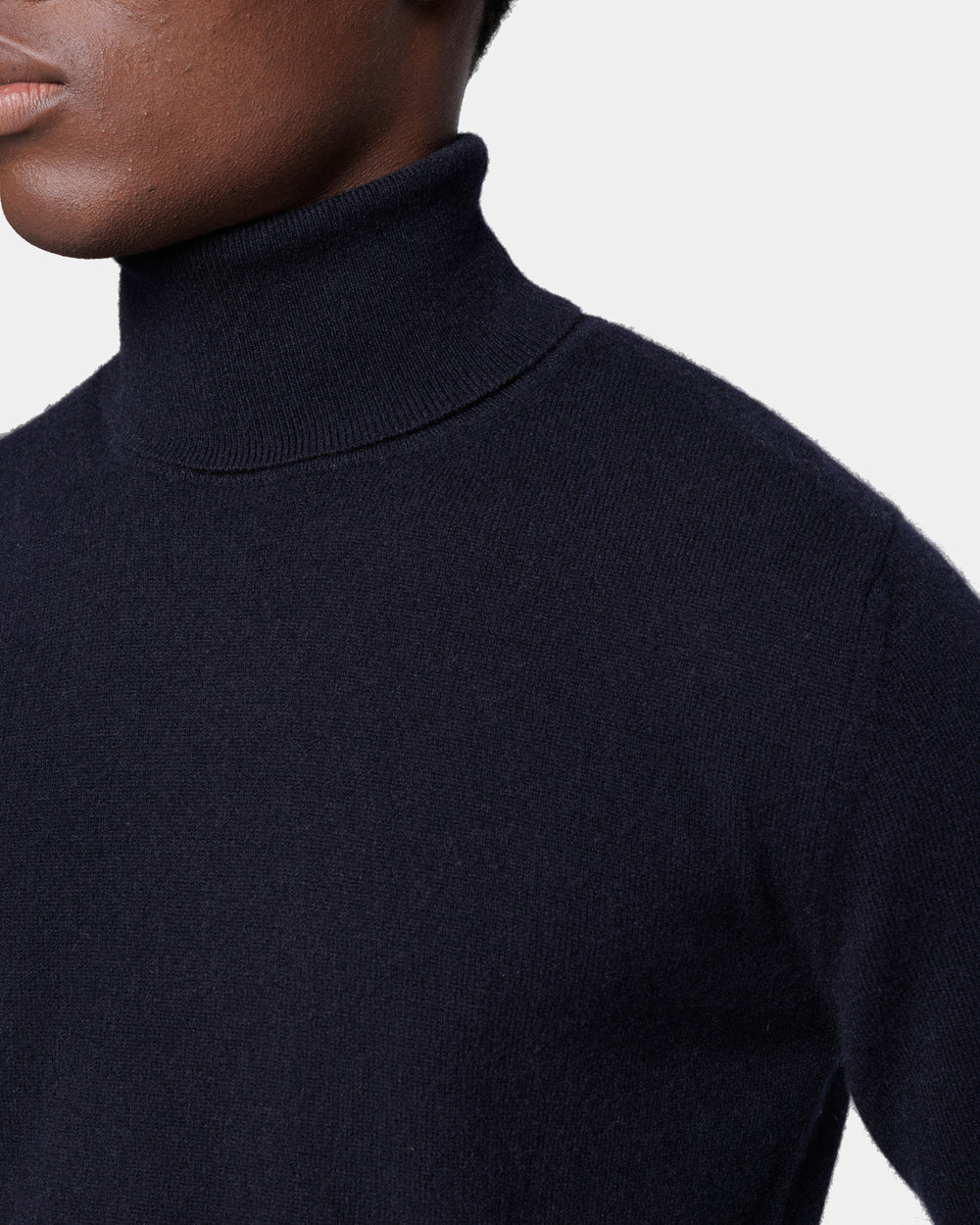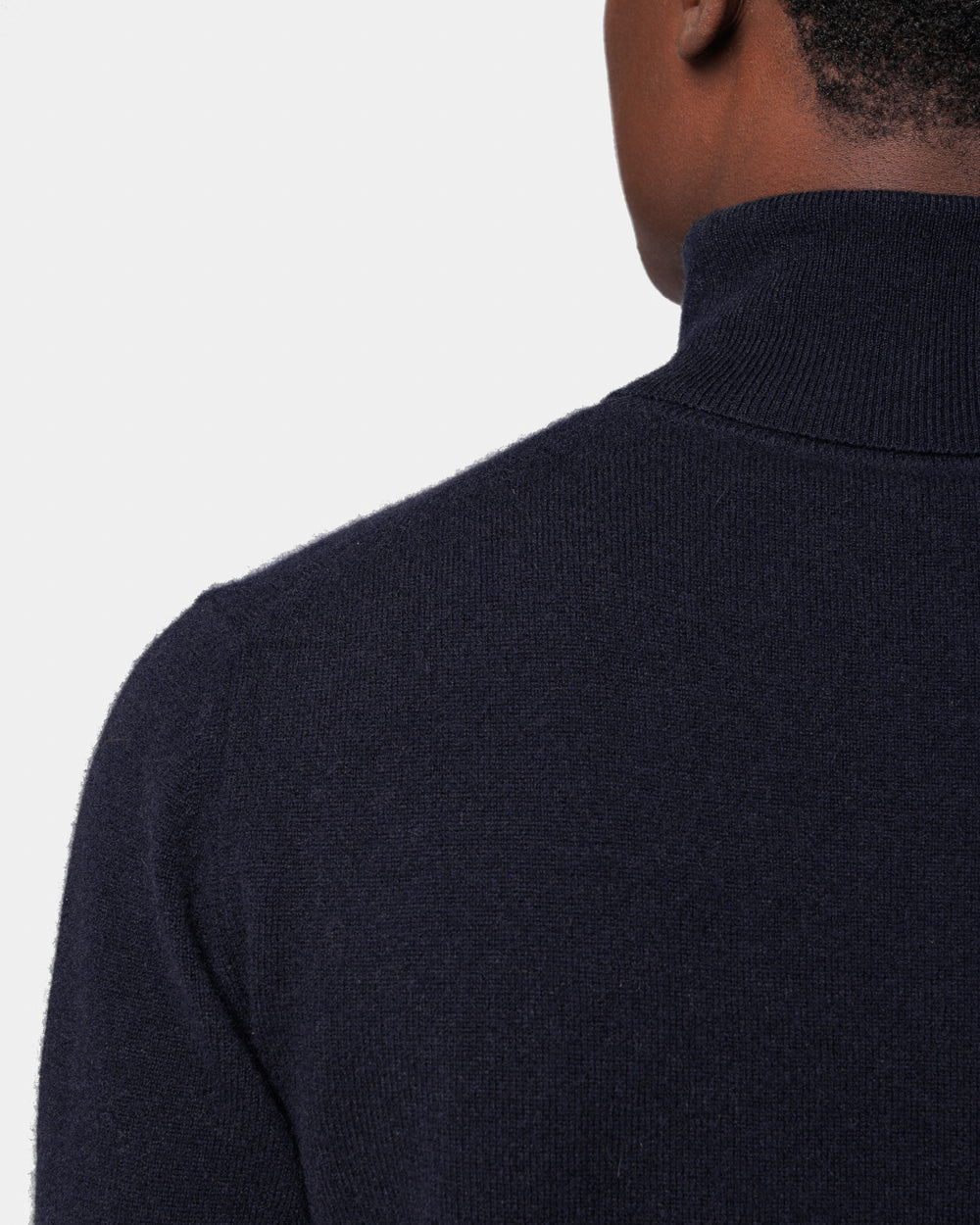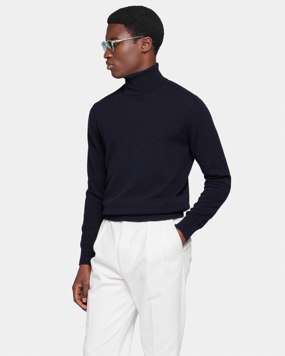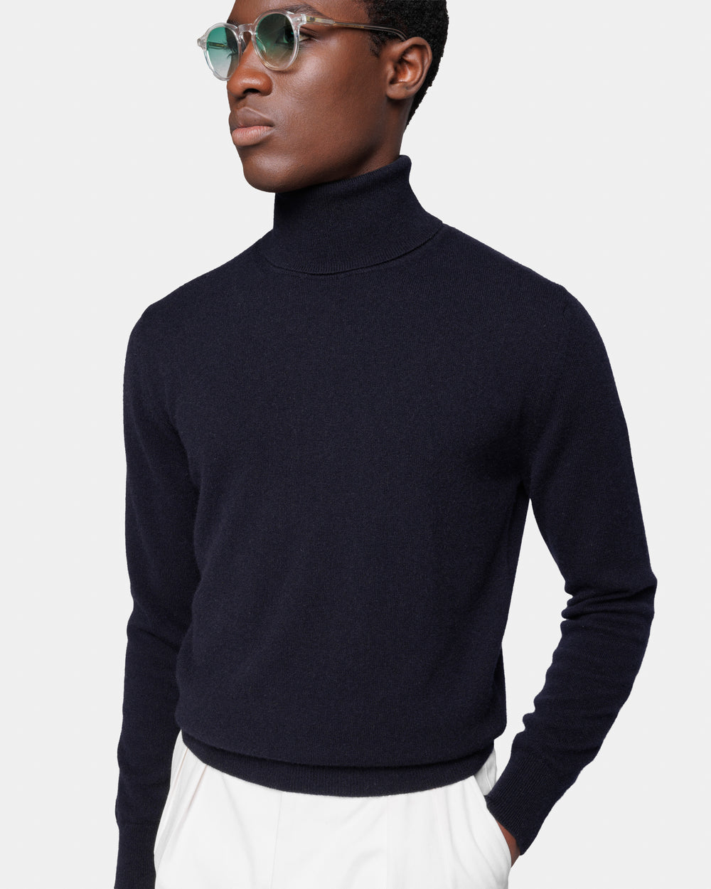 Maglia su misura ad 1 filo dal titolo 2/27 manica lunga tinta unita blu modello dolcevita, realizzata in una pregiata, ricercata e finissima fibra di puro cashmere Crown Reserve proveniente dalle regioni più remote della Mongolia, per arrivare negli stabilimenti di Quarona Sesia in Piemonte, dove viene abilmente lavorata dalla filatura più prestigiosa al mondo per dare vita ad un filato cardato dal titolo 2/27.